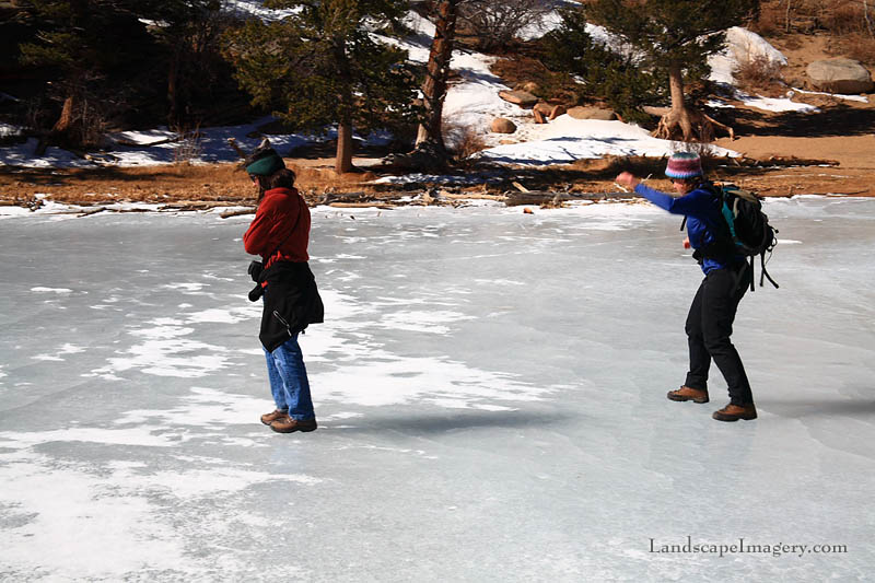 beyond, and before long at all we were at the final run up to Smaller than I had expected, Gem Lake sits in a depression between two swells of orange granite that can almost fool you into thinking you’re at Canyonlands (but not quite). A sparse population of ponderosa pines surrounds the lake, while the understory is largely absent owing to the dominant rock substrate. The water was frozen over to a thickness allowing safe passage across the surface to anywhere but the extreme north end of the lake where the ice was thin and small areas of open water glimmered next to the rocks. We walked out across the ice. Air bubbles deep within gave perspective on how thick it was, but we still heard occasional lurches and booms from the water below as the ice warmed up on top and cracked, sending ominous echoes down through the deeps. I