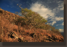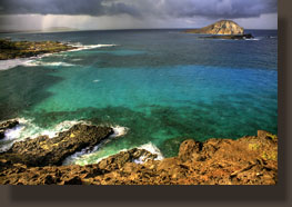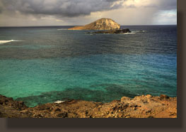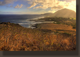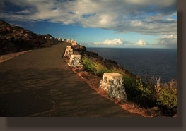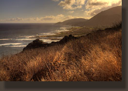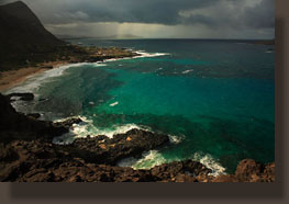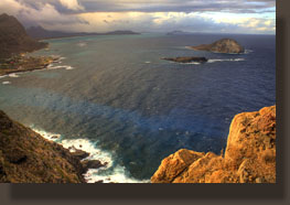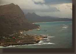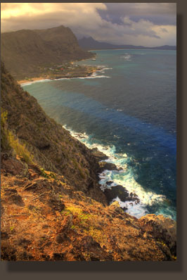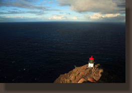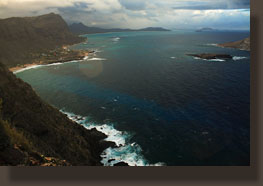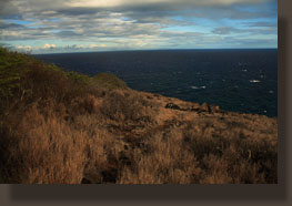 Trail: Steady uphill grade for 1.5 miles and 600’ gain on an asphalt path to an old Coast Guard lookout deck Access: From the Hanauma Bay turnoff on the Kalanianaole Hwy, continue east ~4.5 miles and watch for a parking lot on the south side of the road just before the road curves north. Map: USGS 1:24K Koko Head Fees: None Dave, Andra and I tried to tackle this short walk on easternmost point of Oahu in 2004, but I my poor choice of flimsy footwear required that we turn back before reaching the end. Thus, it was with great satisfaction that I set out on the same asphalt path in 2007 wearing sturdy hiking boots, ready for anything. I also had a nicer day in 2007. The sun was shining brilliantly, with an orange glow that made colors in the vegetation and ocean surge. The route followed an old asphalt road that lead up to an old Coast Guard lookout post and lighthouse. The lighthouse is still there, but I don’t know if it is still operational. I walked up the pavement, admiring the striking view down the southern coast towards Koko Crater, snapping photos as I went, trying to shade my lens from the orange glare of the late-afternoon sun. This was my third hike of the day, and I was tired, but exhilarated. My plane was scheduled to leave later that night, so I was trying to cram as much fun into my last day on Oahu as possible. What struck me was the dryness of the location. The north and east sides of Oahu are lush and green, practically dripping wet at all times, but the south side is more desert than anything else. Everywhere the grass was brown, broken only by gnarled acacia trees with thin, bipinnate leaves and sprawling cactus. At only 1.5 miles, the walk is short if taken briskly, and I was up at the lookout in no time. From up high, I could see purple rainclouds approaching the windward side of the island from the east, obscuring the forked summit of Olomana to the north. People played in the surf of Makapu Beach Park below. Slow-moving waves slogged in from the deeper blue of deep water further out beyond the white bulge of Manana Island, and far out to the east I could make out the dark shape of Molokai. I stayed but a few moments, as the sun was sinking fast and I had yet to find a beach park with a showerhouse before my long flight back to Wyoming. I trucked down the pavement back to the car and headed east to take a shower and watch the sunset at some beach near Hawaii Kai. |