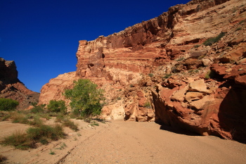 View Larger Map September 29, 2012 In the weeks leading up to the trip out to Utah, I scanned the terrain on Google Earth, checking out interesting features of the landscape and looking for cool canyons to explore. A prominent east-west crack in the San Rafael Swell caught my eye, and after researching things a bit, I learned this was Eardley Canyon. It’s a technical canyon, but Michael Kelsey discusses in his guide book a spot up the north rim of the canyon a ways where one can drop down into the canyon, bypassing the technical drops and enjoy the canyon upstream for quite a ways. So, that was the plan. Griff and I pulled into the tiny sand lot around 8 AM on a typically perfect autumn day in Utah: blue sky, no wind, temperature hovering around 65 degrees. We shoved the cooler under the tailgate for shade, stuffed snacks and water bottles into our packs, and began trekking up the dry wash where 3 tents had been pitched. Brave. I know it’s the dry season, but those clumps of twigs and grass wrapped around the cottonwood trunks 5 feet up show you just where and how wild the water can come charging down through here. But I confess there’s been no sign of rain the three days we’ve been in the area, and this day also looks to be clear and dry. The walk upstream was pleasant as we immediately entered a wide canyon with very high cliffs on either side, the 800-foot southern cliff acting like a giant sun awning for much of the way. Cottonwoods and boxelder trees grew thickly on either side of the wash, and here and there puddles of water sported tiny frogs in the cool shaded air. This stretch took us through the initial uplift of the San Rafael Reef, and in a short time we came out on the west side where the dry wash curved sharply, as if we were hiking up the stem and crosier of a question mark. Boulders littered the wash, and we picked our way carefully upstream. Gone was the shade of the cliff face, as the terrain dropped away to a wider, shallower canyon with fewer trees. Curling around the top of the question mark, we re-entered a deep canyon that was all rock with very little vegetation, but the angle put us right in line with the sun to the southeast, and it was hot. Several large pools of water, greatly evaporated, lined the channel, but mostly it was dry. We slogged on into a fairly straight north-south channel, following Straight Wash behind the reef, and heading south towards the purported entrance to Eardley Canyon. I noted lots of footprints in the sand, but so far we hadn’t seen anybody. Given the early hour, we were again treated to long stretches of shade as the eastern angle of the sun put it just behind the towering apex of the reef to the east. When we reached Eardley Canyon, there was no mistaking it. It was every bit as deep a cut in the rock as it had looked from the satellite images. A series of large, muddy-brown pools guarded the entrance, but these were easily bypassed, and we walked up over slanted, jumbled boulders into the mouth of the canyon. Completely devoid of plant life, the canyon was all rock, most of it vertical. No quaint slot canyon, this one is huge and forbidding. We hadn’t gone more than a hundred meters when we encountered a large pool of the similar opaque, muddy water that could not be bypassed. It was ringed by smooth rock and a 25-foot wall of rock on the upstream end, worn completely smooth by the passage of water and virtually unclimbable. End of the road for us. We admired the bleak beauty of this simple grotto, then headed back down the canyon to Straight Wash. We sat in the shade and tanked up on water. The canyon is a deep slice in a sheet of rock that descends at a sharp angle towards straight Wash. From the wash, there is no canyon wall at all to the west, and we simply found a spot near the mouth of Eardley Canyon and walked up. The hike up the slope was fairly easy, with no major obstacles. Often we could get right on the edge of Eardley Canyon and look down into its depths, at one point admiring the uppermost pool we had visited from a height of several hundred feet. The canyon quickly increased in depth, and soon we were 700 feet above the channel, high up on the dry rim with only gnarled junipers and cactus for company. Some canyons are wet and lush oases in the desert, but not Eardley. The higher we got, the more we could see up stream of it, and it was mostly barren, with a scattering of junipers and sagebrush in the narrow band of soil near the bottom. Mostly what we noted were the nearly-vertical walls of red rock, all broken and crumbled at sharp angles, very unlike the smooth undulating canyon walls of the Navajo and Wingate sandstone further south. Voices rose up from below; unintelligible mutterings so distorted by diffraction within the narrow canyon walls it was impossible to tell even how many humans were in the group. Maybe only one guy, muttering to himself. We watched from above, but could see nobody. The sun was beating down