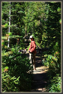 August 13, 2008 Hemangiosarcoma is a tumor that occurs in older, large breed dogs, affecting males more than females. It has something to do with blood vessels, but even though I’ve read about it, I can’t really picture it. Opinions seem to differ on treatment, but I’ve never read anywhere that you can expect your dog to live more than half a year once this tumor is diagnosed. It’s bad, no two ways about it. Enter Frank, my canine hiking companero for the last 11 years, and carrier of a large splenic hemangiosarcoma tumor. The damn tumor makes Frank tired and anemic, and the prednisone we give to ease the pain robs him of muscle mass while the tramadol he also takes for pain seems to zone him out sometimes, as opiates are apt to do (I’m told). Frank’s eagerness to explore the woods is stifled not only by the tumor, but by hip dysplasia, a compromised cranial cruciate ligament, bridging spondylosis, and advanced arthritis in his spine and shoulders. It’s been a long and happy dog’s life, and it’s winding down. The body that has taken him faithfully over thousands of miles of wilderness terrain is just giving out. Frank was given 6-8 weeks to live at his diagnosis on June 20. So here we are midway through week 7. What do you do with your dying friend, let him ride out his days lying on the couch sleeping, or get him out on the trail to enjoy what has always been his favorite activity? Andra and I lean towards the latter option, which is also the option I hope will describe my last days on this earth. Keeling over suddenly from a heart attack while hiking the Milford Track on my 80th birthday sounds like a pretty good way to go to me. So here we are, putting on our boots at the Lone Pine Trailhead outside of Red Feather Lakes, a trail chosen because of its lack of extreme elevation gain or loss. Another complication for this trail is that Makenzie, our younger, sophomoric canine hiking enthusiast, has about a dozen stitches in her leg stemming from a lost battle with a barbed wire fence, and we’ve been instructed to keep her out of water for 10 days, a nearly impossible request. You’ve never seen a dog so drawn to water. She’s part porpoise. So, a trail that appears to have only limited water access is a bonus, and that also describes the Lone Pine trail. We stuff some water and food into a backpack and I throw that on. It’s windy at the trailhead as two horsetrailers are offloading their cargo for a trail ride, and this makes it unusually chilly for August. We’re both wearing long sleeved shirts. Before the dogs can get into any trouble by saying hi to the horses, we hit the trail and the parking lot disappears from view. The first part of the trail is shaded and cool, with a wonderful mixture of aspen, lodgepole pine and a Douglas fir. One particular Douglas fir stands right next to the trail and is easily 4 times larger than any other tree in sight. We move slowly, making sure Frank doesn’t feel the need to walk faster than is comfortable for him. Only 6 months ago, he would have been vying with Makenzie for the lead position, trotting gamely up the trail to be the first to sniff the air and chase the squirrels. Now he walks sedately behind me, never stepping off the trail. His decline has been extremely rapid. I can see a slowing of his walk even from two weeks ago. Dave, Matt and I attempted to tackle this trail in February of 1997. Foolish. We never even made it to the trailhead in Dave’s Ford Probe. I was new to Colorado then, and had no idea how long the snow persisted in the high country. We made it as far as the Level 6 road gate, parked, and slogged up the hill in the snow for awhile before turning back. Driving back to Red Feather Village, we passed an old man stuck in the snow who was trying to dig his high-centered jeep out with no apparent success. We gave him a ride back into town. It seems hard to believe it’s been 11 years since that event. Life slips by pretty fast. I follow the map closely, trying to gauge when we might first encounter water. I make the call a little late, and Makenzie, who is ahead of us on the trail, comes back through a small trickle of water with wet paws. She hasn’t dunked in the water, there is too little of it, so no harm is done. Nevertheless, we leash her for awhile since the water runs near the trail. She is profoundly unhappy at this development, and pulls like an ox against the leash, choking and wheezing. She was never great on a leash, but when she lived in the city in 2003, she was tolerable. Since we’ve lived in a rural area for 4 years with absolutely no need to leash her while walking, she’s completely forgotten all leash etiquette, and pulls like a dogs who’s never even seen a leash before. At 65 lbs, she can pull pretty hard, too. The trail passes through a wonderful stand of lodgepole pine, with slanted sunlight shining underneath the canopy to glow on the verdant understory of whortleberry. The creek flows in a liquid ribbon near the trail, lined by wildflowers and less drought-tolerant shrubs like water birch and currant. We cross a logging road that is not on my map, but appears to be an extension of one that is. Then we cross it again. We take the leash off Makenzie, and she rockets up the trail like a rubber band, overtaking Frank and speeding up ahead. Frank seems to be having a good time, wagging his tail and stopping more often to show interest in smells just off the trail. The temperature rises gradually and Andra and I are happily forced to ditch the long sleeved shirts. We settle into a nice pace, Makenzie in front, then Andra, then Frank and me at the rear. The sky is brilliant August blue overhead, clear and sparkling from several days of heavy rains. In fact, the trail is washed out in the center and scoured clear of pine duff from obvious heavy runoff. The trail snakes its way through the woods and we catch glimpses of the plains to the east through the trees. The trail reaches