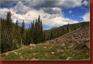 August 24, 2008 I’m heading west under blue skies on the Poudre Canyon highway, my favorite stretch of road in America. The foam-capped rapids of the winding Poudre River come into view occasionally at certain bends in the road, gleaming in the sunshine. Makenzie pants heavily in the back seat, poking her head out the back window to sniff the mountain air. It’s a beautiful August day. I pilot my Subaru up Long Draw Road, and watch for the signs to Trap Park. I drive for a while, feel like I’ve gone too far, and stop the car to check the map. Nope, not far enough. Too anxious. I get back in, drive a little further on, and see the sign on the right for Trap Park. Pulling into the parking lot, I see two other cars, but nobody around. I put on my boots under the warm sun, slather on some sunscreen and shoulder my pack for releasing the hound. Makenzie bounds out of the back seat and circles the area with her nose to the ground, tail spinning wildly in a clockwise corkscrew pattern. Sometimes simple wagging just isn’t enough, I guess. We head on up the wide trail through a small meadow, then start up what appears to be a road blasted out of the mountainside. Sharp limestone boulders line the trail, and at the first bend, we leave the trail to check out Trap Lake, below. Anglers surround the lake, standing still and watching for fish. From my vantage, it appears that Trap Lake is very shallow, or perhaps filled with exceedingly clear water. To the north, I can see Clark Peak and an enormous anvil cloud that has developed disturbingly early in the day. This does not bode well. Resuming the uphill tromp on the old logging road, Makenzie leads the way into the forest. Tall, dark-green pines line the road, with spruce mixed in here and there. A valley begins to form and drop away to the right while the trail continues to climb steadily. I let my mind wander and enjoy the flicker of dappled sunshine on my face. Makenzie is in dog paradise, panting, wagging, slobbering and trotting back and forth across the trail to sniff whatever it is of interest to dogs in the wild. After about a mile, the trail opens up into Trap Park, an open meadow nearly 2 miles long that fills the valley running northeast away from Iron Mt, which is clearly visible way off on the horizon. There’s a bit of a choice to make, as the trail appears to branch just before crossing Trap Creek. I decide to take the right fork, cross Trap Creek, and head southwest along the trail that hugs the meadow’s western edge. The imposing bald summit of Flat Top mountain looms over the valley’s east wall, beckoning for exploration, and is likely the destination of the left fork of the trail back at the creek crossing. Thick clumps of choppy-looking cumulous clouds blot out much of the sky, and the signs indicate that it will be raining before much longer. The trail grows ever fainter as it proceeds, narrowing from a road to a path. After about 2 and a half miles, the trail crosses Trap Creek a couple more times through tall sedge and bulrush, and shortly after a sign proclaims the wilderness boundary and reviews the rules. From here on the trail is not well defined, and I am often simply making my own way up the ever-narrowing valley along Trap Creek. I encounter the trail periodically, and lose it shortly after. No matter. I know where I want to go, and I can see it regularly through the breaks in the forest. My goal is the saddle north of Iron Mt. Perhaps Iron Mt too. Blue skies in the mountains often make my goals too ambitious, so I purposefully try to keep it simple. It is necessary to cross Trap Creek numerous times, but it is so narrow I can simply hop across it. A shaded glen next to the creek beckons for a rest break, and so Makenzie and I sit down and share a peanut butter and jelly sandwich, and a few moments of silence, listening to the wind whisper through the conifer needles overhead: a very unique mountain sound. You never hear that pitch of wind through trees in the deciduous forests east of the Rockies where the large maple and ash leaves clatter and rustle. There’s no rustling sound to the wind blowing through conifers. You need stiff pine and spruce needles to stoutly resist the wind to get that silky, lonely whisper of air, that sound that instantly makes clear to you what wilderness is. We hike on, reaching an exposed rocky face at the base of the Iron Mt massif. I can see the way to the saddle from here, and it looks very steep and rocky, not very inviting. Even less inviting are the thick white clouds racing across the sky from the west, portents of a building storm. I find a large flat rock some ways up the rocky expanse, and observe the reddish cliffs and rockfalls of the western side of the valley. It is open boulder field as far as I can see to the southwest, towards Iron Mt. I try to judge if the summit is in view, but I can’t tell if I’m looking at the actual summit or a false summit. Clouds continue to build, and now they have dark gray bottoms. After watching for 15 minutes, I decide it would be foolish to continue higher up, and decide that in fact we are going to be lucky to make it to the car without a solid drenching. We head down the valley, and I sometimes see my own bootprints in the soft soil along the creek. By the time we reach the wilderness boundary, the sun is completely hidden from view, and the wind makes it chilly. I throw on my flannel shirt, and we march on quickly through the meadow. The white puffy clouds from an hour ago have merged into a solid bank of dark gray with a wet, ragged bottom that seems to scrape the trees tops on the ridges. The air smells wet, and just around the time we cross Trap Creek near the bottom of the meadow, the sky opens up on us. It is a classic monsoon-season drenching thunderstorm. Thunder rolls across the valley, and I am extremely pleased that we have made it to the comforting-security of the trees again before the lightning has shown up. I th
